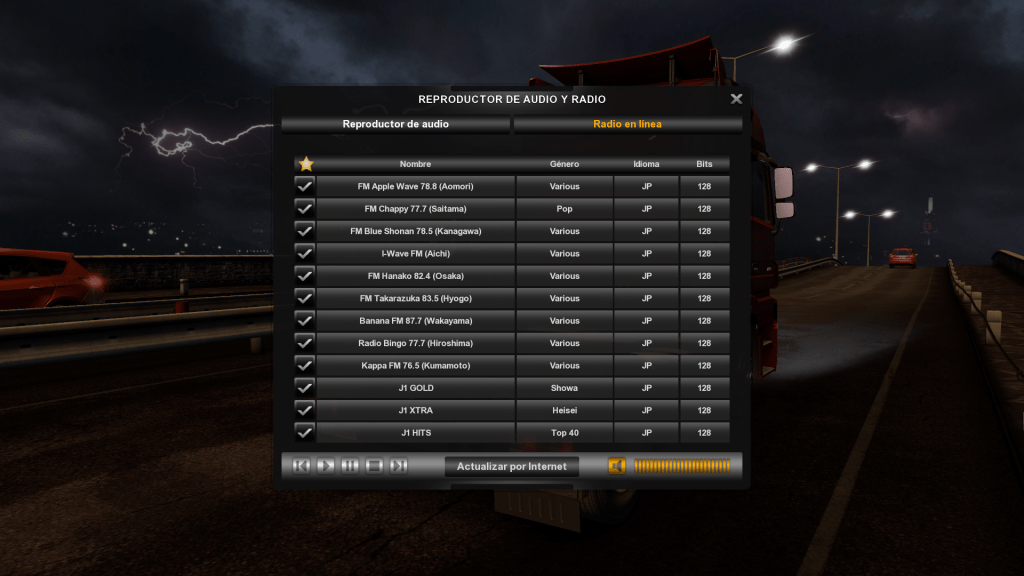 Como buen vehículo funcional de cuatro ruedas, tu camión lleva incorporada una radio configurable. Hay dos opciones entre las que elegir: puedes cargar canciones desde tu ordenador (aunque quien dice canciones, dice cualquier archivo reproducible: podcasts, ASMR, etc.) y puedes escuchar cadenas de radio reales. Es una especie de Radio.Garden con bastantes menos opciones, pero la idea es la misma: tienes una lista de estaciones de varios países y puedes sintonizarlas según se te antoje a tiempo real. No solo eso: si las cadenas que hay en el juego te parecen pocas, puedes añadir las tuyas con solo editar un archivo en Notepad. Hay quien añade la Cadena Ser y hay quien añade 100 estaciones rusas, pero hoy vamos a hablar de la radio japonesa.